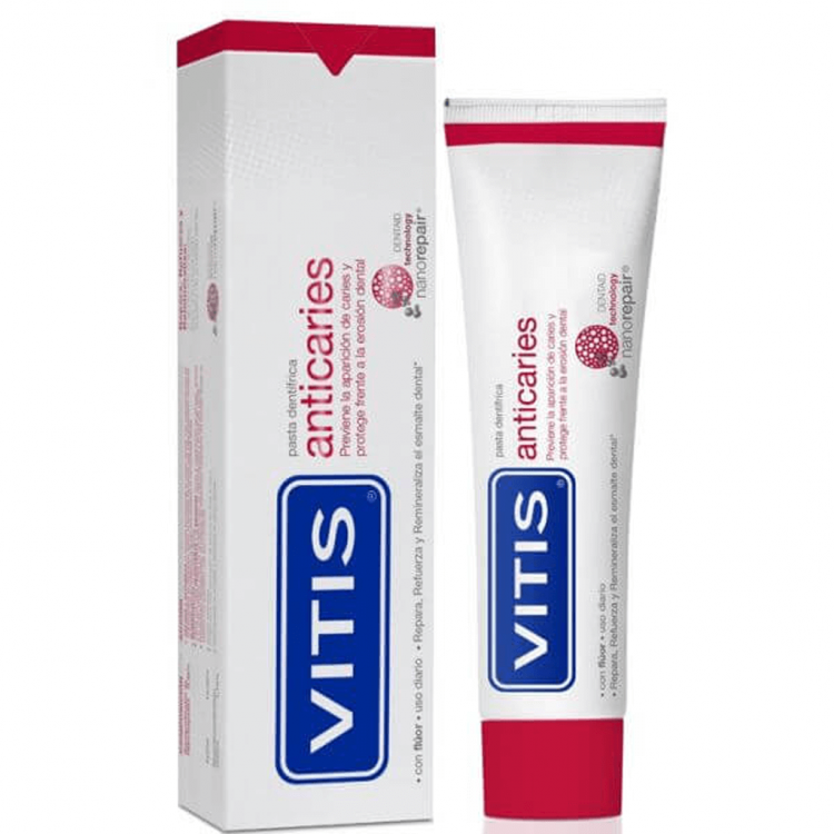 VITIS® anticaries é uma pasta de dentes de uso diário especialmente desenvolvida para prevenir cáries a três níveis. Graças à sua tripla ação anti cáries, repara, reforça e remineraliza o esmalte para uma maior prevenção da cárie dentária, protegendo também contra a erosão dentária.