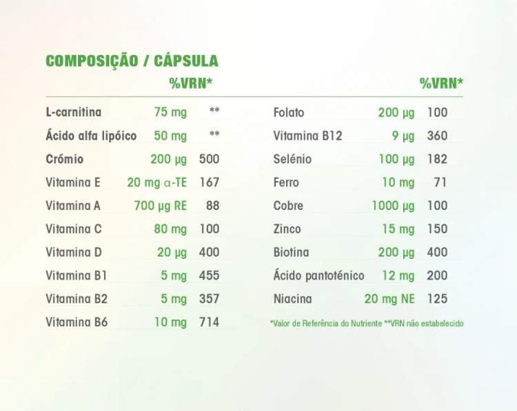 Suplemento alimentar minerovitamínico antioxidante, com L-carnitina, ácido alfa lipóico e 200 µg de levedura de crómio, vitaminas e minerais, que contribui p ara o equilíbrio metabólico, manutenção de peso e controlo dos níveis de açúcar no sangue. Ajuda a manter o metabolismo ativo, protege as células do stress oxidativo e reduz o cansaço e a fadiga. Indicado em caso de metabolismo lento (dificuldade em perder peso, má alimentação, sedentarismo, cansaço constante…), para redução do índice de gordura corporal ou controlo dos níveis de açúcar no sange.