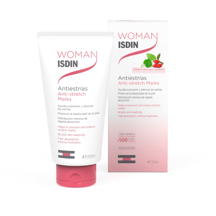 WOMAN ISDIN Antiestrias é um creme corporal que contém centelha asiática, óleo de rosa mosqueta, manteiga de Shorea e vitamina E com ação antioxidante. Possui evidência clínica que demonstra eficácia na ajuda da prevenção e redução de estrias, assim como uma valorização superior da sua fórmula pelas suas características sensoriais. O único creme antiestrias com estudos clínicos em mais de 500 mulheres.