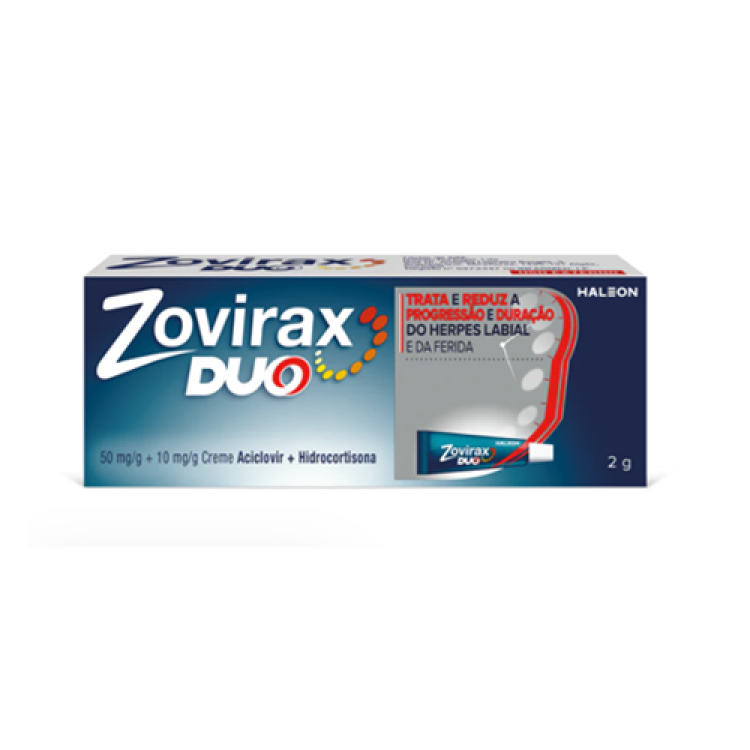 Zovirax Duo é um tratamento para o herpes labial, clinicamente comprovado que ajuda a impedir o aparecimento da ferida do herpes e a acelerar o tempo de cicatrização, quando aplicado aos primeiros sintomas. Apenas para uso cutâneo no herpes labial nos lábios e pele junto aos lábios. Não aplicar nas membranas mucosas (olho, interior da boca, nariz ou órgãos genitais). Contém 50mg/gr de creme de Aciclovir e 10mg/gr de Hidrocortisona.